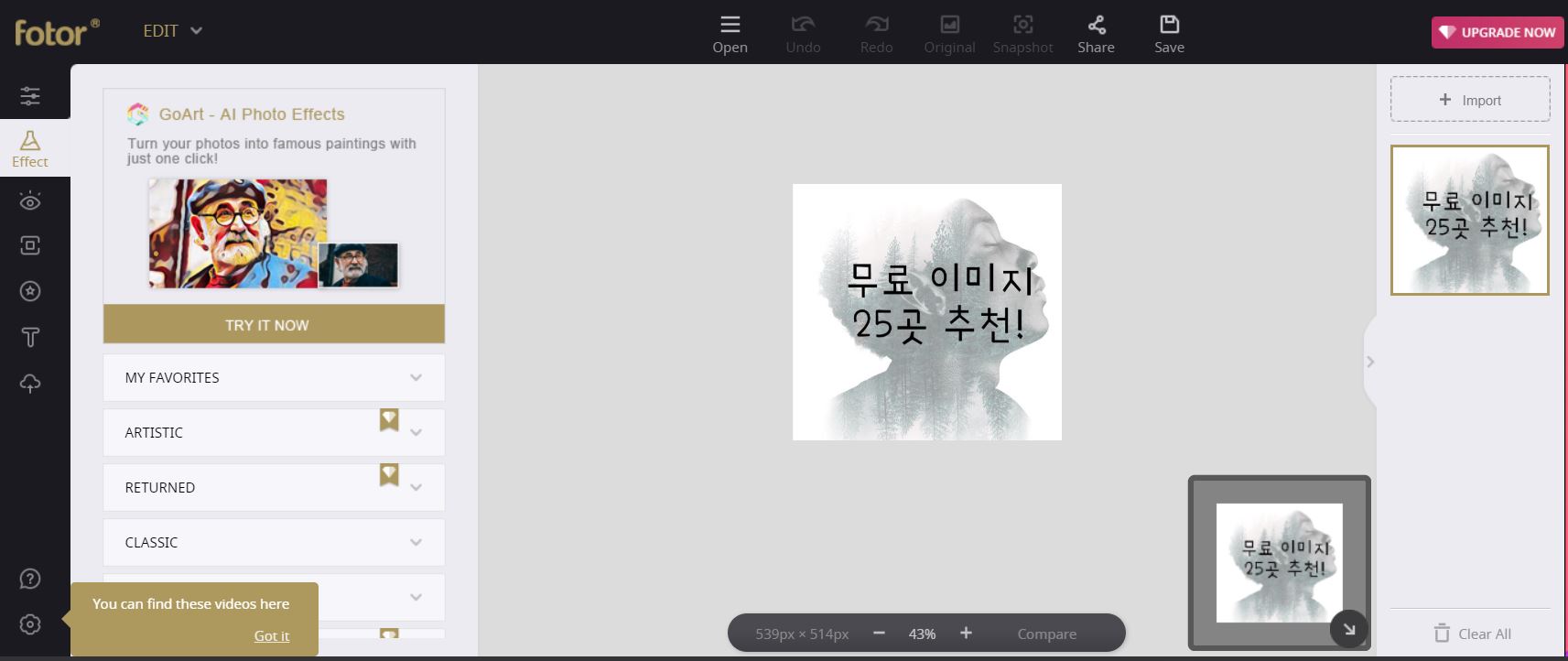 에디트, 보정효과, 이팩트효과, art효과, 도형삽입 등 여러가지 효과를 낼 수 있으며,